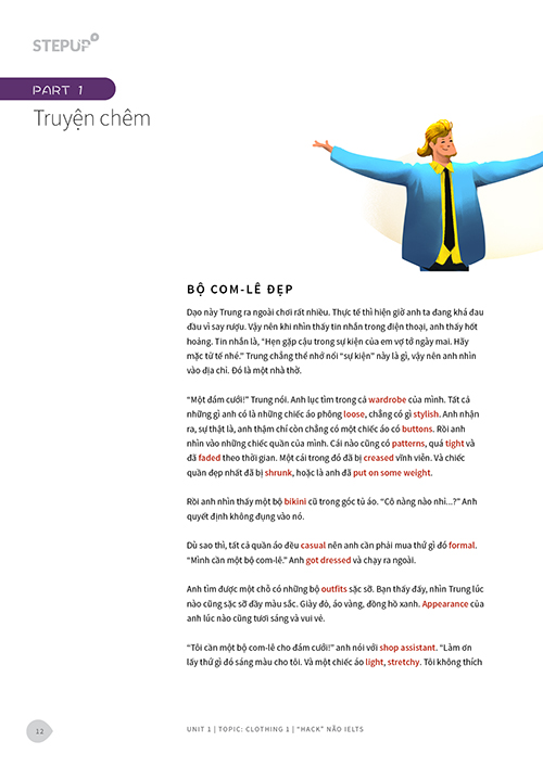Bước 1: Đọc chuyện chêm. Bạn chỉ cần đọc thôi, bộ não con người sau hàng chục triệu năm tiến hoá đã có khả năng bẻ khoá được từ tiếng Anh nằm trong văn cảnh tiếng Việt. Chiều nhớ từ vựng từ Anh sang Việt sẽ được xử lí ngon lành. Mọi truyện trong cuốn sách đều vô cùng hấp dẫn và hài hước, bạn sẽ thích đọc tới những truyện cuối cùng.